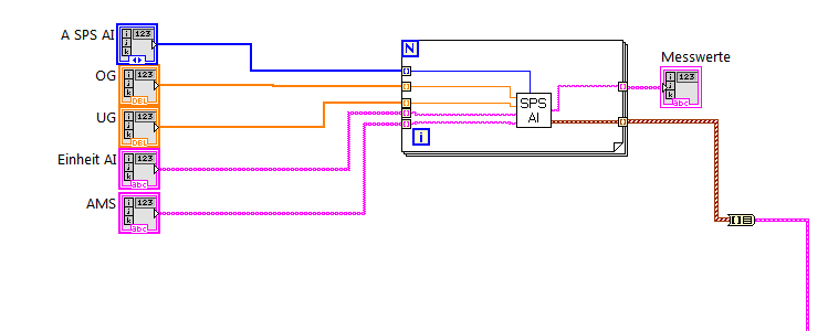 Dann rufst du das SPS-AI-VI in einer Schleife auf, an der du das Array of Cluster als Eingang hast und als Ausgang (nach der Schleife) je ein Array of Strings und ein Waveform-Array bekommst.