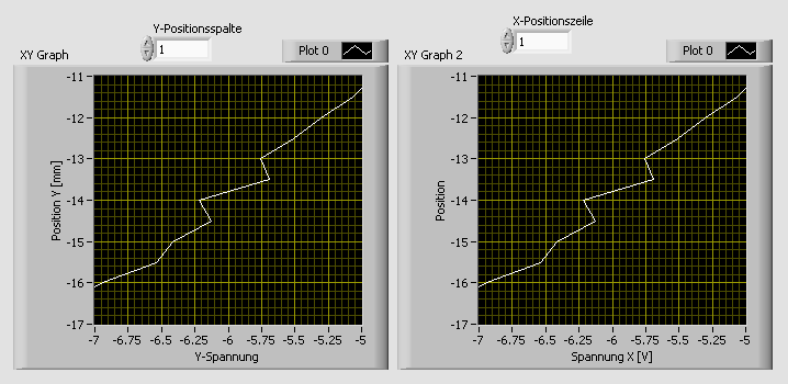 Ich verstehe aber natürlich deinen Einwand...klar wären hier verschiedene Positionen möglich...in Wahrheit sollten bei der realen Messung dann solche Sprünge nicht vorkommen, sondern mit wachsender Position auch wachsende Spannungswerte kommen, also die (nicht strenge) Monotonie gewährleistet sein. Sorry...ich habe bei der Erzeugung der Fakedaten aber nicht speziell darauf geachtet, solche Fälle zu vermeiden. Ich habe "einfach" mit nem Zufallsgenerator gearbeitet - genau genommen sogar mit zweien - und zu jedem per Schleife erzeugtem "glatten" Wert ein bisschen was addiert oder subtrahiert. Ich wollte damit nur zeigen, dass keine Spalte -respektive Zeile - gleich der anderen ist, man also das Interpolate 2D.vi nicht (so einfach?) verwenden kann, weil es genau davon ausgehen würde.