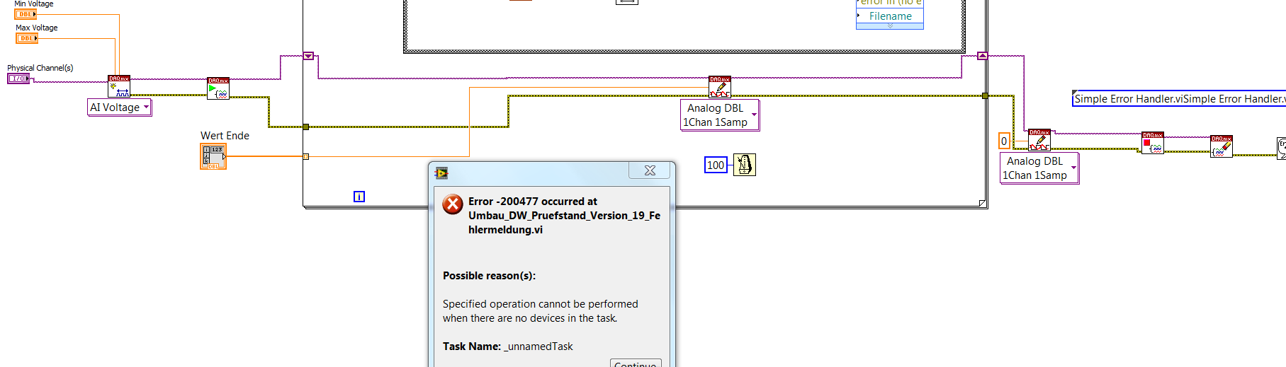 Kannst du dein VI auch in LV2011 anhängen? Und wenn du auf extern definierte DAQmx-Tasks (wie in deinem Bild) verweist, solltest du auch schreiben, wie diese definiert wurden. Deine MAX-Einstellungen kennen wir nämlich auch nicht…
