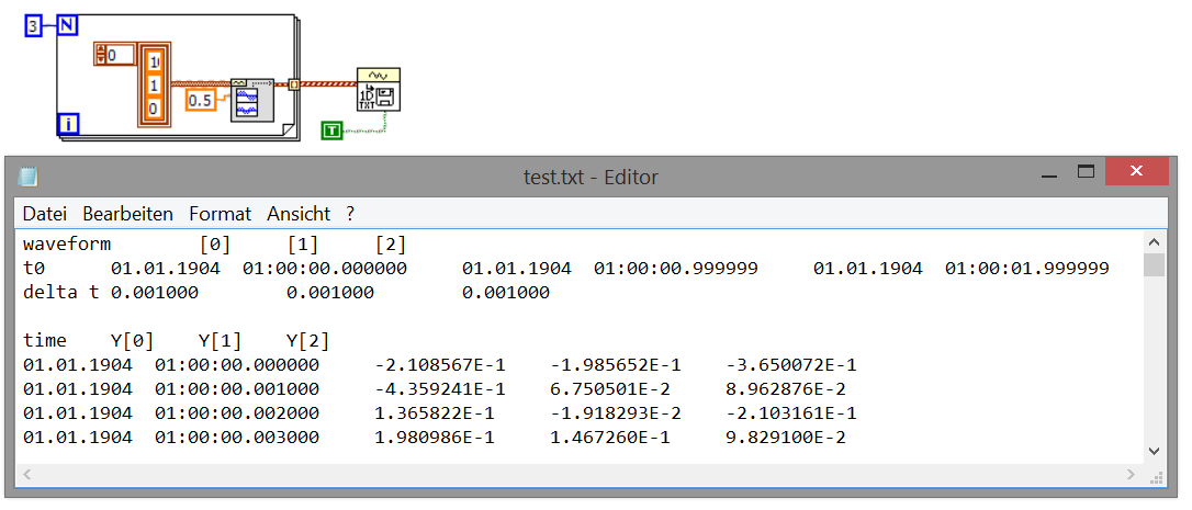 Ich versuche es jetzt mit dem Export Waveforms to Spreadsheet File.