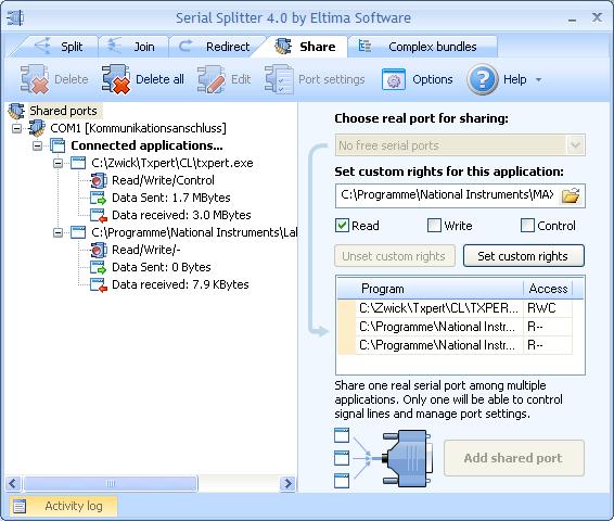 Lese momentan den per "Eltima Serial Port Splitter" geteilten Com-Port (Zwick-Software hat Lese-, Schreib- und Kontroll-Recht, LabVIEW nur Leserechte; Abbildung im Anhang) per "Assistent für Instrumenten I/O" ein und kann mir dort den eingehenen Datenstrom ansehen. Siehe Abbildungen im Anhang. Das Bild der Zwick wurde kurz danach aufgenommen Die Werte im Zwick-Programm sind konstant. Nur der Kraftwert schwankt zwischen -0,65 und -0,66