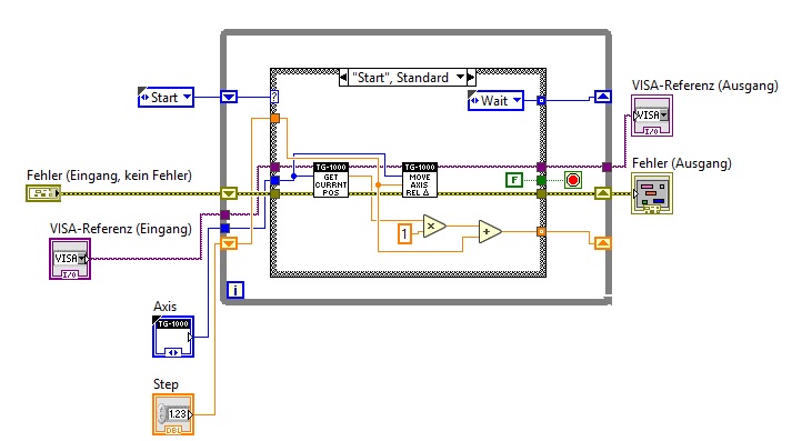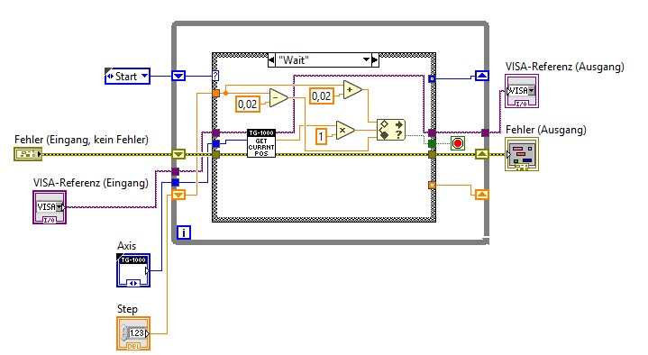 Sowas habe ich mir schon gedacht und das habe ich heute nach Lesen deiner Antwort versucht umzusetzen, indem ich im WAIT-State nochmal die WAIT-Konstante an das Schieberegister anschließe. War das der richtige Gedanke? Jedenfalls ist da auch noch ein Problem. Denn der Scan-Vorgang lief mit den SubVIs, die warten sollen, bis der Motor an der richtigen Position ist, nicht. Es wurde ein Y-Step gemacht und danach ist nichts weiter passiert. Es macht also den Anschein, als ob man danach in dem WAIT-State gefangen wäre. Alternativ habe ich die SubVIs wieder gegen die normale Relativbewegung des Motors ausgetauscht und mit einem Timer gearbeitet. Dann lief der Scan-Vorgang soweit durch. Aber das ist ja nicht die feine englische Art Huh