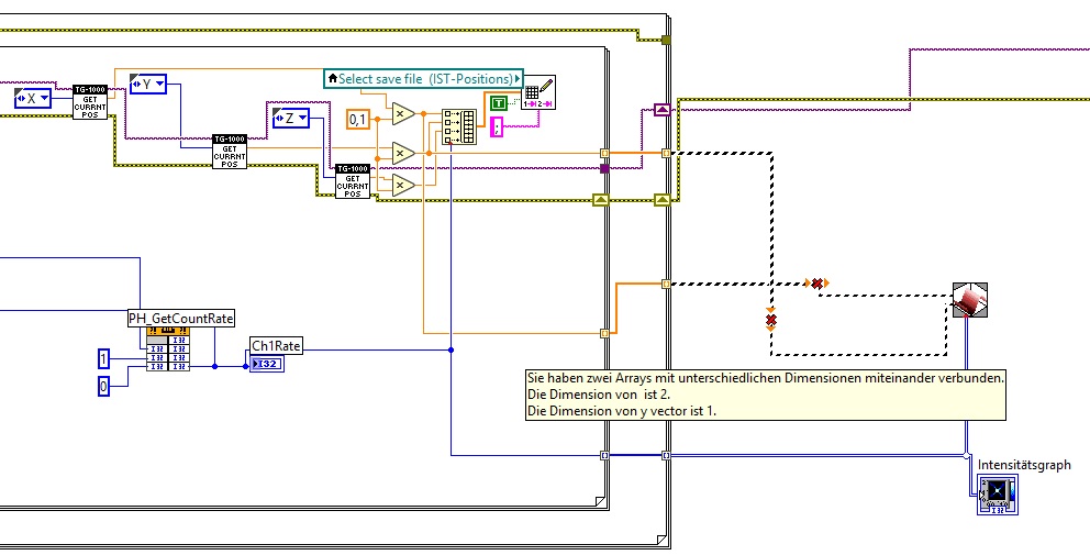 Nein, ich speicher den Array nicht in einem Schieberegister zwischen, sondern lese in der inneren For-Schleife jeweils die Positionen der einzelnen Achsen aus, erstelle damit ein Array und diesen habe ich dann mit "Tabelle schreiben" an den 1D-Eingang angeschlossen. Im Anhang ist ein Bild dazu. Ist das so falsch?