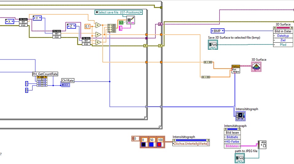 Die Reise soll jetzt noch dahin gehen, dass der Photonen-Detektor bei jeder Position den Wert angibt. Ich stelle mir das so vor, dass ich diesen Messvorgang auch einfach in die innerste Schleife packe, in der auch die Positionen gespeichert werden. Dann erweitere ich das Array und schließe den Wert daran an. Und dann wird XYZ und Anzahl der Photonen in die Tabelle geschrieben. Das gilt es dann nur noch zu visualisieren. Wenn nur XY gescannt werden, ist das ja nur ein Plot. Wenn allerdings auch Z gescannt wird, dann brauche ich ja für jeden z-Step einen neuen Plot und somit auch für jede Ebene eine eigene Tabelle oder irre ich mich da? Wie kann man das am elegantesten lösen?