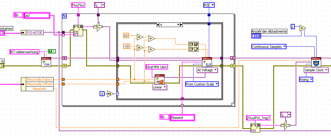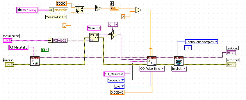 für den Takt nutze ich das Timing VI - Abtasttakt und geb als Quelle entsprechend pxi_trigger0 an. Was meinst du mit dem "durchschleifen"? Wenn ich bei den Countertasks dieses Timing VI - Abtasttakt benutze sagt mir eine Fehlermeldung dass das keine richtigen Timing Einstellungen sind für diesen Task? muss ich eine andere Instanz des Timing VI´s nutzen?