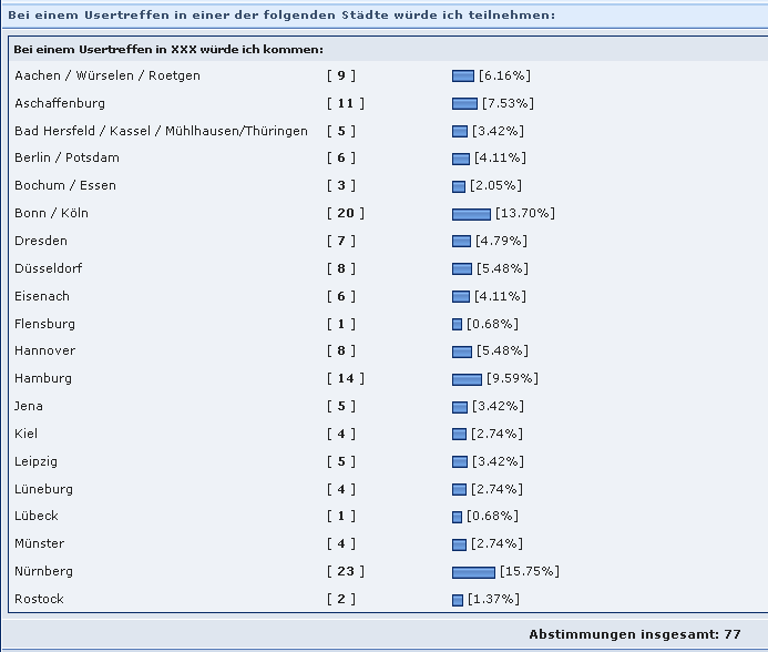 Das nächste:usertreffen:findet also nach eurem Wunsch in Nürnberg statt, wobei Köln/Bonn und Hamburg nicht leer ausgehen sollen. Denn ich bin dafür, dass dort die darauffolgenden Usertreffen stattfinden.