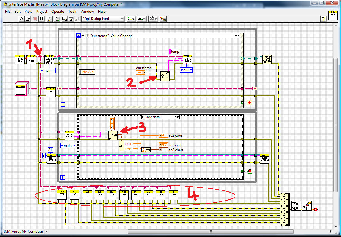 Und zuletzt: versuche Mal all deine globale Variablen mit Queues ersetzen. Ich meine du brauchst ja im Prinzip nur eine Queue pro Schleife. Diese Queue machst du von einem unbestimmten Datentyp (String oder Variant) und kannst beliebige Daten (vorher in String oder Variant umwandeln) in die Queue schreiben und genauso beim Empfänger in den entsprechenden Datentyp zurückwandeln.
