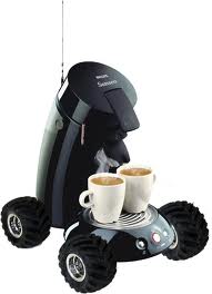 Die Kaffeemaschine könnte mit entsprechenden Sensoren und Aktuatoren ausgestattet werden (evtl ein zweiter Mindstormsats), mit dem Robbi kommuniziert und "die Bestellung aufgibt".
