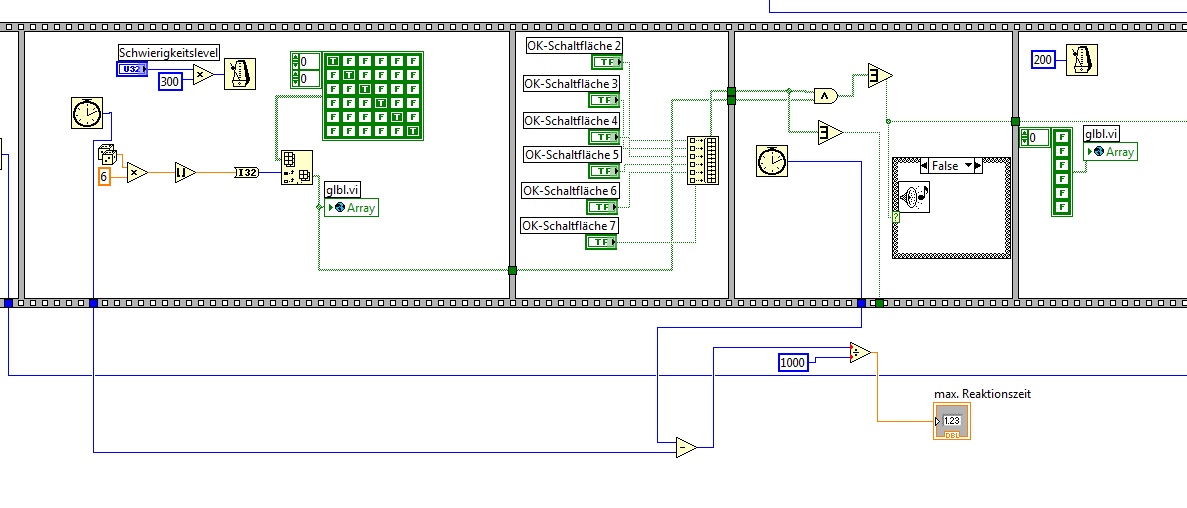 ich bins nochmal. Wie man im Bild unten sehen kann, habe ich die eine Zeitausgabe erstellt. Sie gibt die max. Reaktionszeit aus. Also je nach eingestellten Schwierigkeitsgrad verkleinert oder vergrößert sich die Zeit, die man hat um dein Button zu drücken.