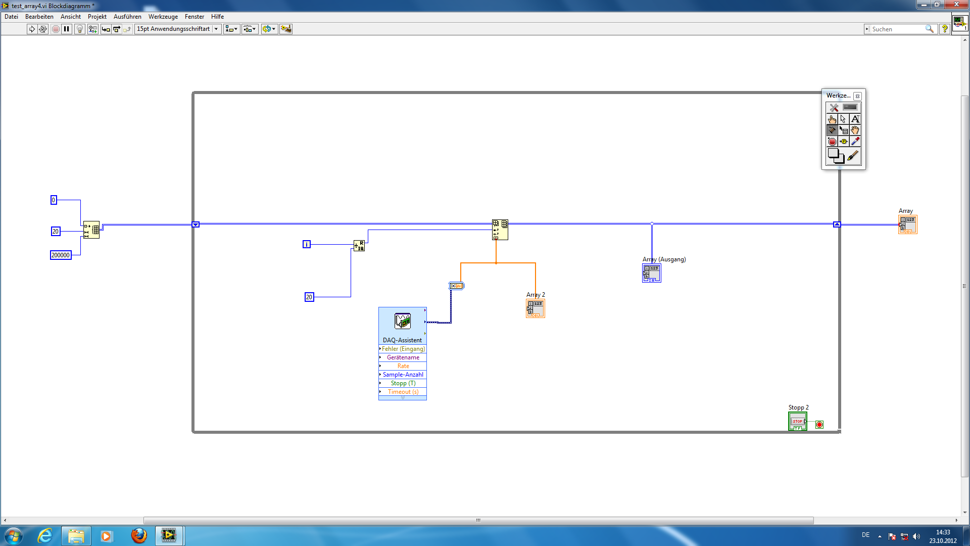 Zitat:Leider schreibt der das Array trotzdem noch nicht voll, sondern nur wenn ich direkt ein "Test-Array" erstelle und einfüge aber das mit den DAQ-Daten geht noch immer nicht es bleiben nur die initialisierten 0en stehen?