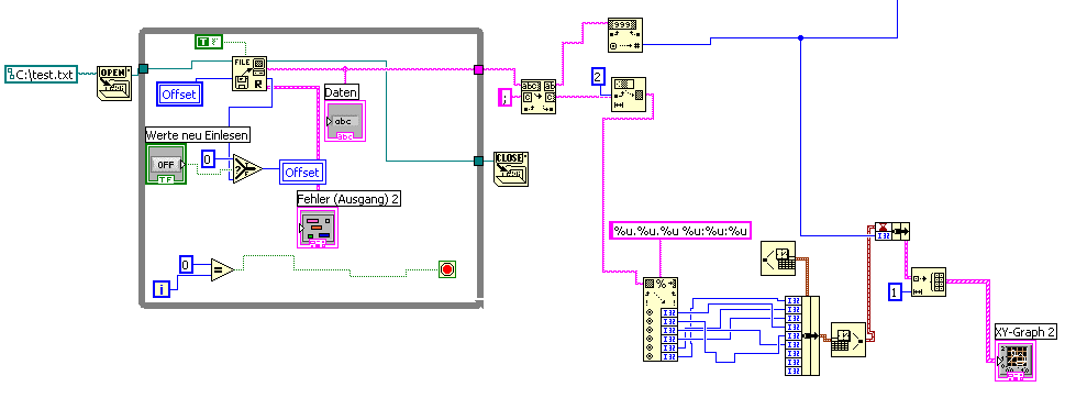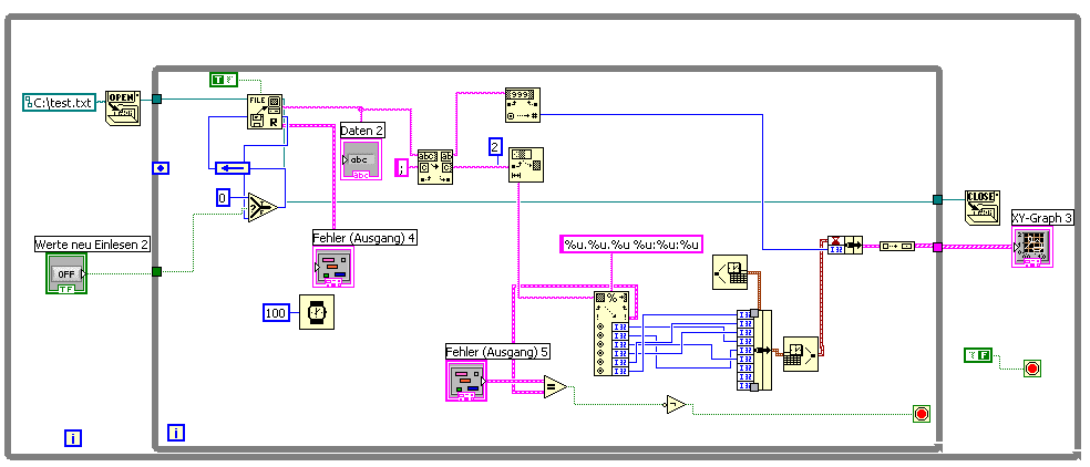:mellow:Ich habe dich gefragt, ob du das 'Read from Spreadsheet' VI benutzen kannst... deine Antwort war positiv. Nur benutzen, wie ich es im oberen Beispiel gezeigt habe, tust du es nicht.