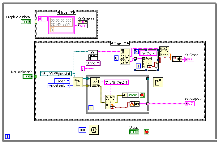 Im unteren Beispiel zeige ich, wie man eine Textdatei ZEILENWEISE einliest, jede Zeile scannt und per Autoindexing in ein Array überführt, wobei die Einleseschleife per Errorcluster auf das EOF reagiert und sich selbst beendet.