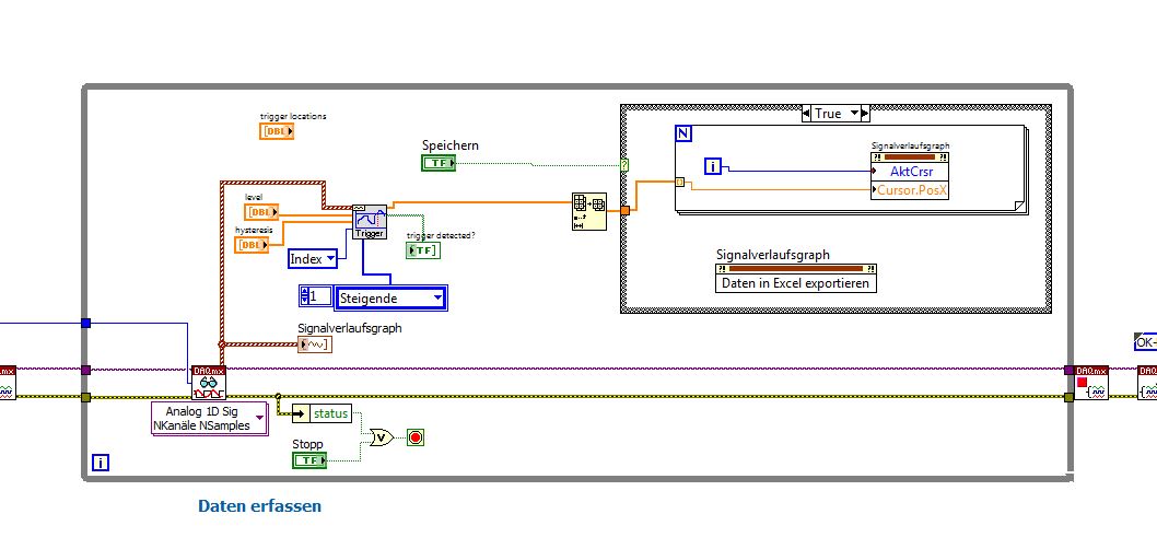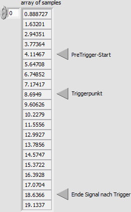 Alles, was du jetzt noch machen musst, ist, dass du aus der Waveform (bzw. deren Y-Array) rund um diesen Index die gewünschte Anzahl Samples mittels ArraySubset "ausschneidest": die gewünschte Anzahl "PreTrigger"-Samples vor dem Index und die beötigte Anzahl Samples ab dem Triggerpunkt!