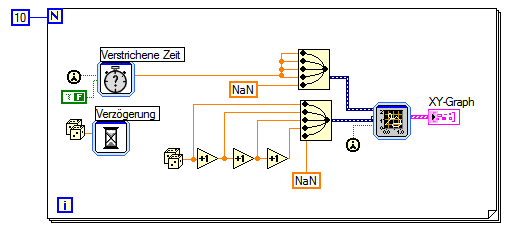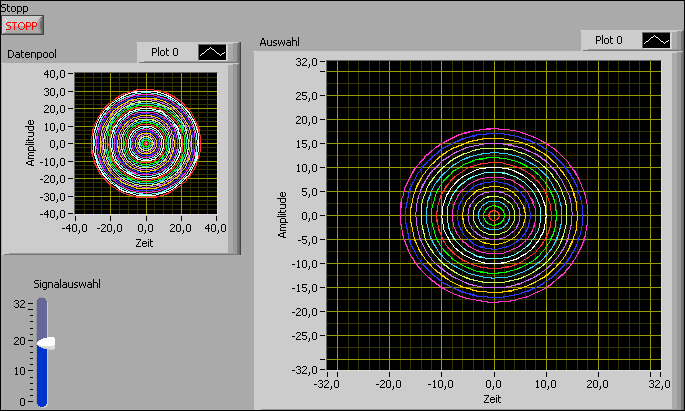 Also hier das gleiche Vi wie weiter oben, aber Lösung mit Express-XY-Graph. Aber Warnung: Im Vergleich zum VI mit Signalverlaufsdiagramm wird jetzt alles ganz einfach, und das ist auch der Grund, daß alle hier versammelten Experten Express-VIs ablehnen. Also rechne damit, daß Du bei Verwendung kollektiv geächtet wirst (und auch ich bleibe auf Grund dieses Vorschlages nicht ungeschoren) Mellow