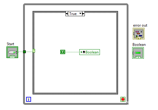 Alles andere drumherum ist RubeGoldberg-Nonsens! Die Case-Struktur erhält immer ein TRUE als Vorgabe, die lokalen Variablen sind unnötig, das FALSE-Setzen des Ausgangs in der Sequenz kommt im Haupt-VI nicht an (DATAFLOW!), die WhileSchleife ist unnötig (da nur einmal durchlaufen), ...