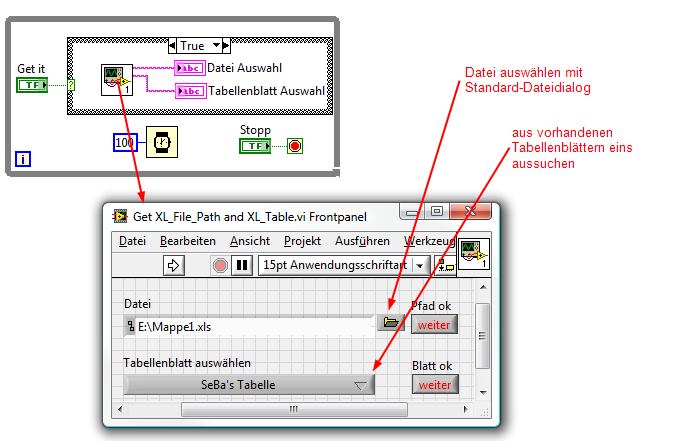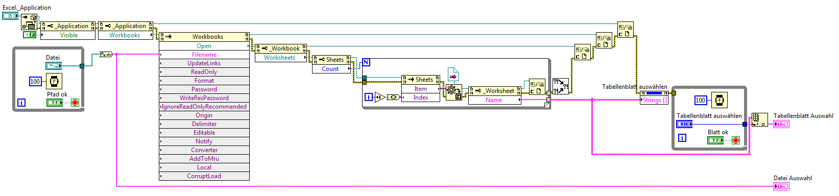 Ich dachte da an z.B. eine Dialogbox, wo der User zwei Fenster zur Auswahl hat. Im einen gibt er die Exceldatei, im andren das Tabellenblatt an. Es liegt eine Vorlage für Excel vor, aber wenn in eine Datei später noch ein mal was gespeichert werden soll muss diese wieder auswählbar sein, daher soll die Pfadangabe für die Exceldatei ebenfalls variabel sein.