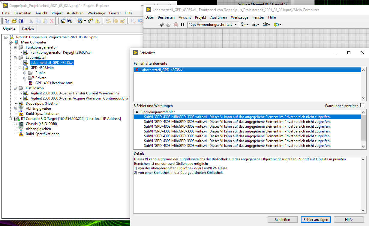 Im Ordner Labornetzteil möchte das Beispiel VI "Labornetzteil_GPD-4303S.vi" sogar dass die Public und Private Ordner direkt im Projekt mit eingefügt werden und auch im selben Ordner liegt. Habe euch, wenn ich das VI mal ein eine Ordnerebene höher ablege, die Fehlermeldung mal abgelegt.