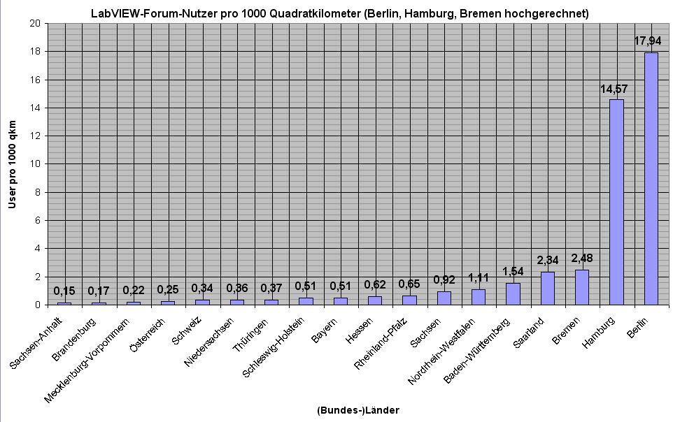 Ich habe die Anzahl der LabVIEW-Forum-Nutzer pro 1000 Quadratkilometer berechnet (Stand: 22.09.2006, 20:30 Uhr, ohne Gewähr). Berlin, Hamburg und Bremen sind hochgerechnet, weil sie kleiner als 1000 Quadratkilometer sind.