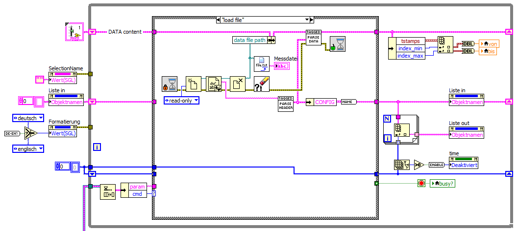 Zitat: Der Cluster sollte eigentlich in einem Schieberegister der Statemachine liegen. Dieser Cluster sollte alle relevanten Daten (also auch Schleifenzähler für deine Wiederholungen etc.) enthalten. Als Beispiel dafür kann ich dir das mitgelieferte Grundgerüst für ein XControl empfehlen: auch dort hat man (quasi) eine Statemachine vorliegen, die ihre Daten mit 2 oder Schieberegistern speichert!