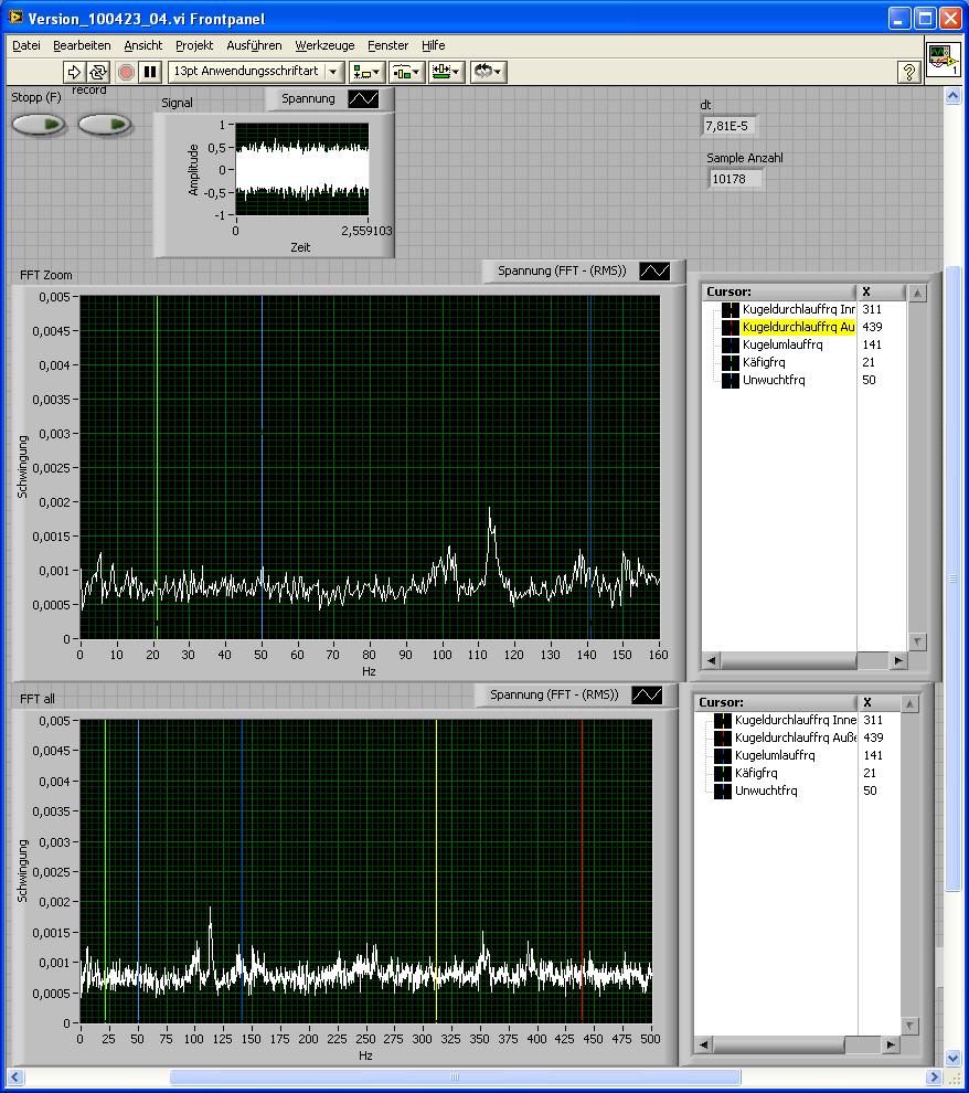 Und ich bin ziemlich sicher: LV gaukelt dir ein konstantes dt vor, so wie es dimitri schon gesagt hat! Wenn du winkelsgetaktet abtastest, darfst du den DDT (Dynamic data type) und WDT (Waveform data type) nicht als Eingangssignale für die FFT-VIs verwenden. Du müsstest als Ausgang des DAQmx-Read-AI- VIs nur ein "1D-Array of Double" ohne jegliche Zeitinformation verwenden. Damit kommen dann aber die FFT-VIs nicht zurecht...