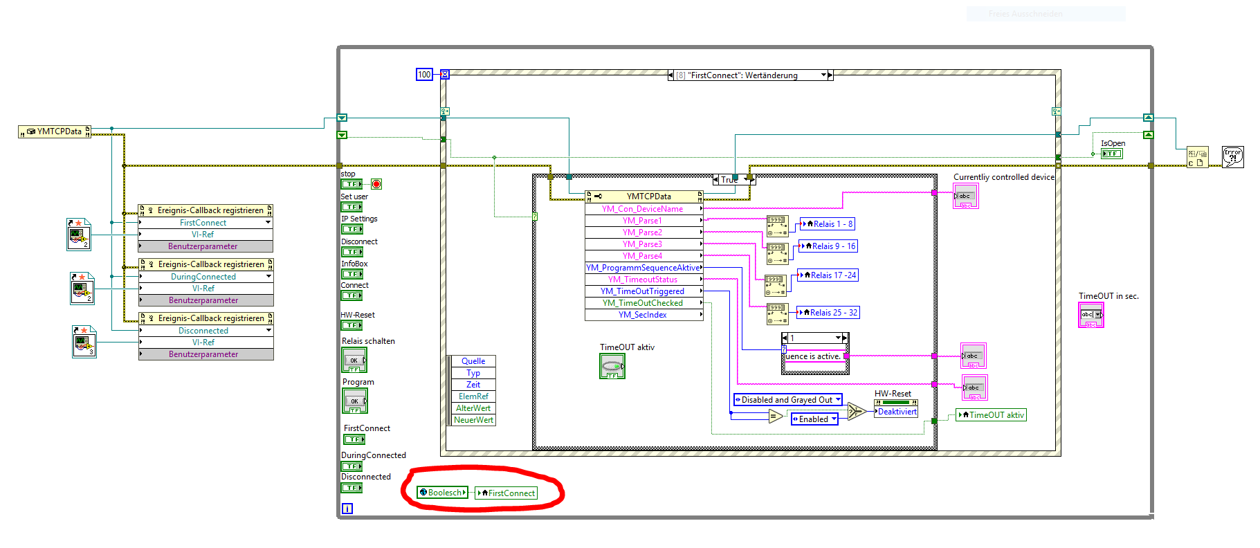 Ich empfehle das, was im Bild dargestellt ist, im Timeout-Case zu platzieren (geht natürlich auch dort, wo jetzt die nicht funktionierende Anweisung steht). Bei dem Element "FirstConnect: Wert(SGL)" handelt es sich um den Eigenschaftsknoten Wert(signalisierend). In der IF-Sequenz muss die Globale Variable wieder zurück gesetzt werden, sonst würde der Event-Case kontinuierlich ausgeführt werden.