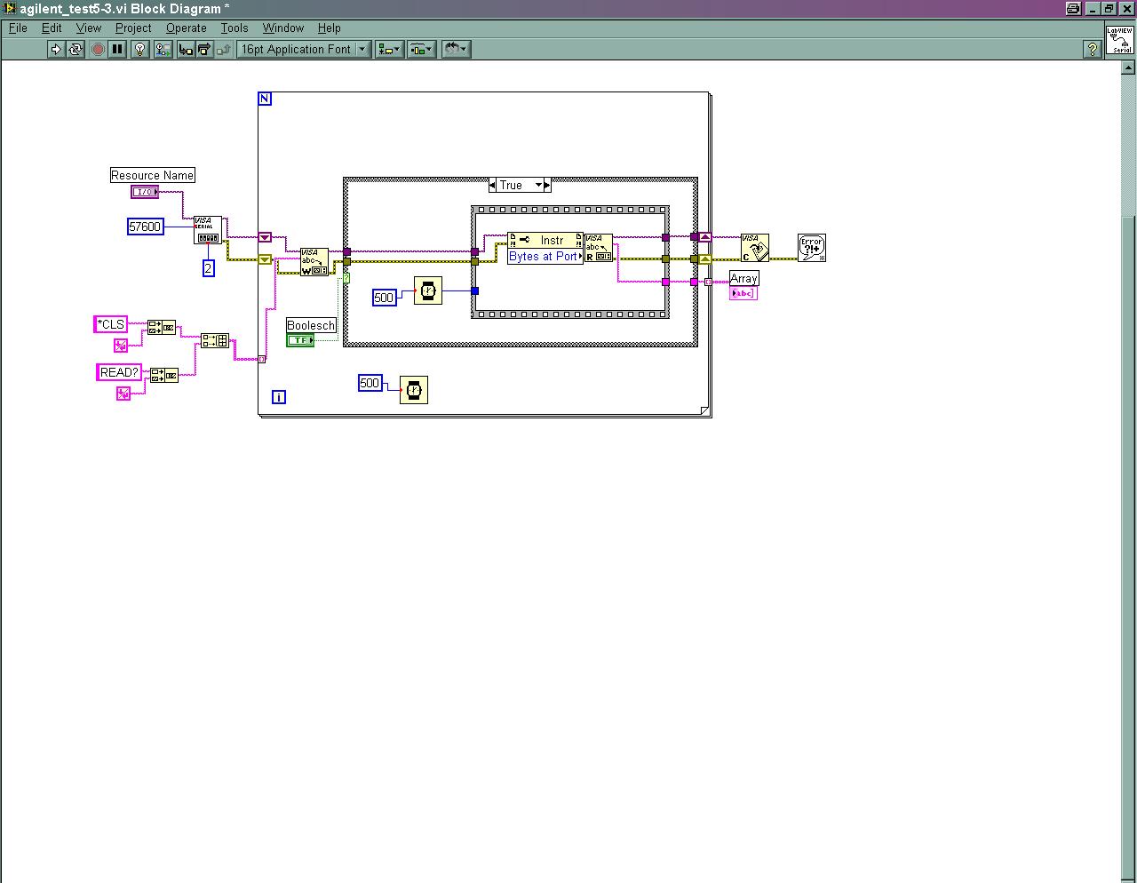 Hatte ich auch schon ausprobiert ( s. angehängtes VI agilent_test5 ), aber auch das will bei mir nicht. Wenn ich das READ? in die Schleife mit reinpacke, und direkt an das VISA:Write übergebe, dann gehts auch nicht ( hab aus Testgründen die Schelife mal wieder mit 1 indiziert, s. agilent_test5_1 ).