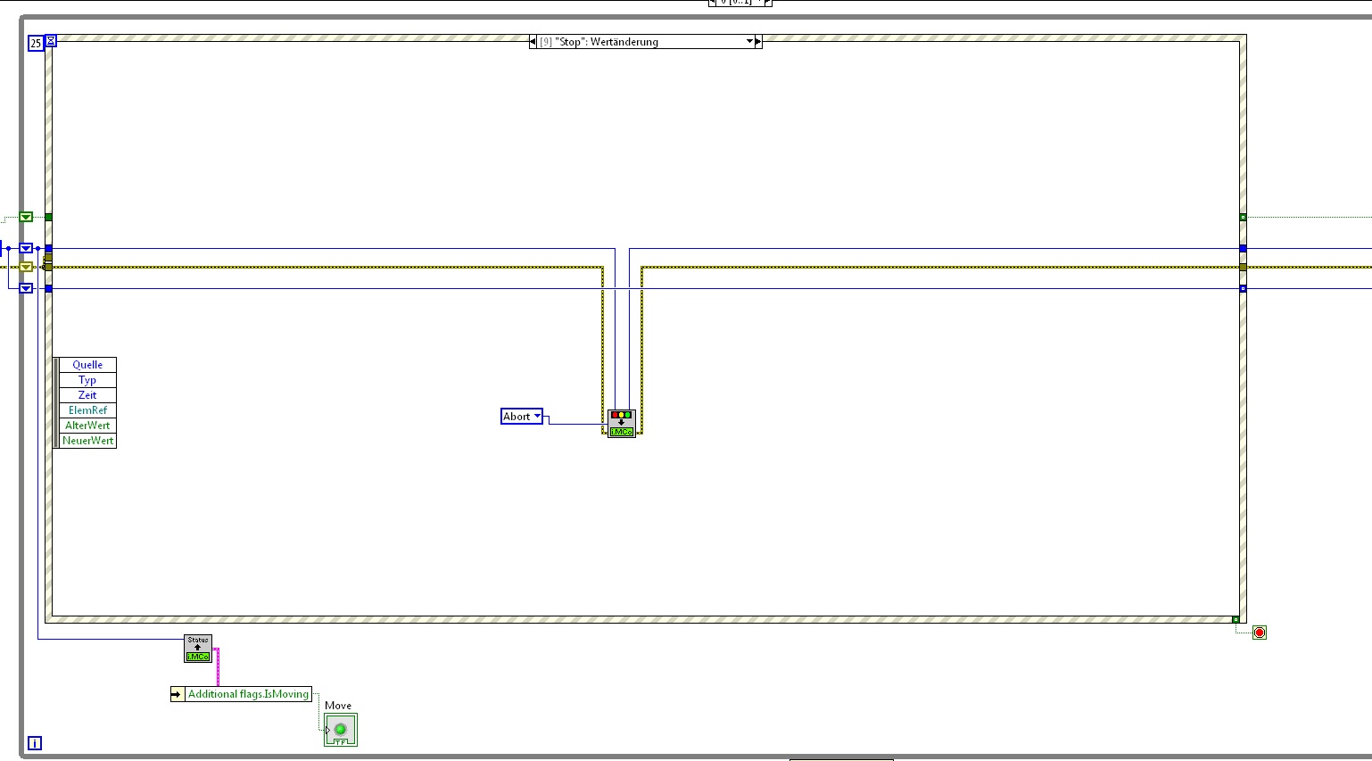Ich habe doch nur zwei Wartezeiten einmal die, die den Timeoutcase auslöst und einmal das Interval von 500ms das den Labjack ausliest. Verkürze ich dieses Intervall läuft die Achse nicht mehr, anscheinend ist die Zeit zu kurz um ein Signal als Startbedingung zu verarbeiten und meinen Status auszulesen...