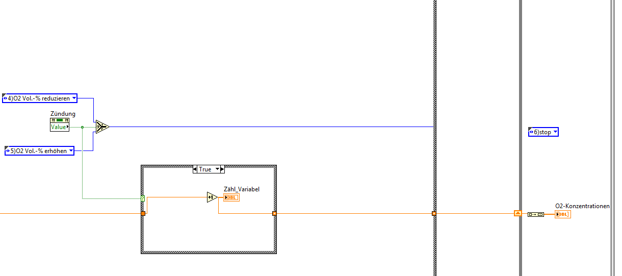 Eine Frage zur meinem State: Beim Reduzieren des O2-Gehaltes wird von O2 Vol.-% immer der Rückschrittwert abgezogen und zwar ständig. Z.B wenn es beim 20 Vol.% O2 gezündet wird, dann soll von disem Gehalt der Rückschrittwert abgezogen werden und aus diesem Wert aus soll O2 Vol.% bis zur nächsten Zündung erhöht werden aber es wird ständig der Rückschrittwert abgezogen, da es ja anscheinend in der Kammer immer noch was zündet und es dementsprechent rot leuchtet. Wie schaffe ich, dass NUR das erste rotes Blinken als ausschlaggebend genommen und dementsprechend die dazugehörige O2 Vol.-% gespeichert wird ? Also danach wird bisschen runtergefahren ( Aktuelle zündkonzentration-Rückschtittwert) und bis zur zweite Zündung (erste rotes Blinken) rampe hochgefahren(Erhöhungswert addiert).