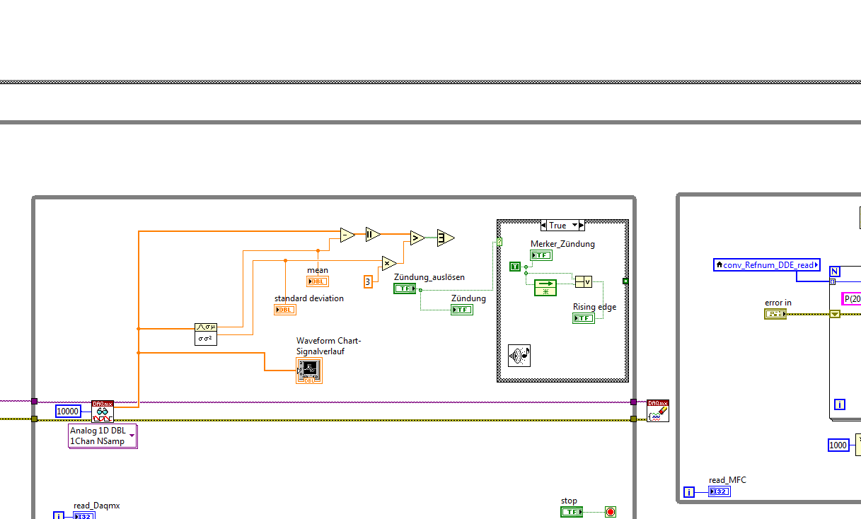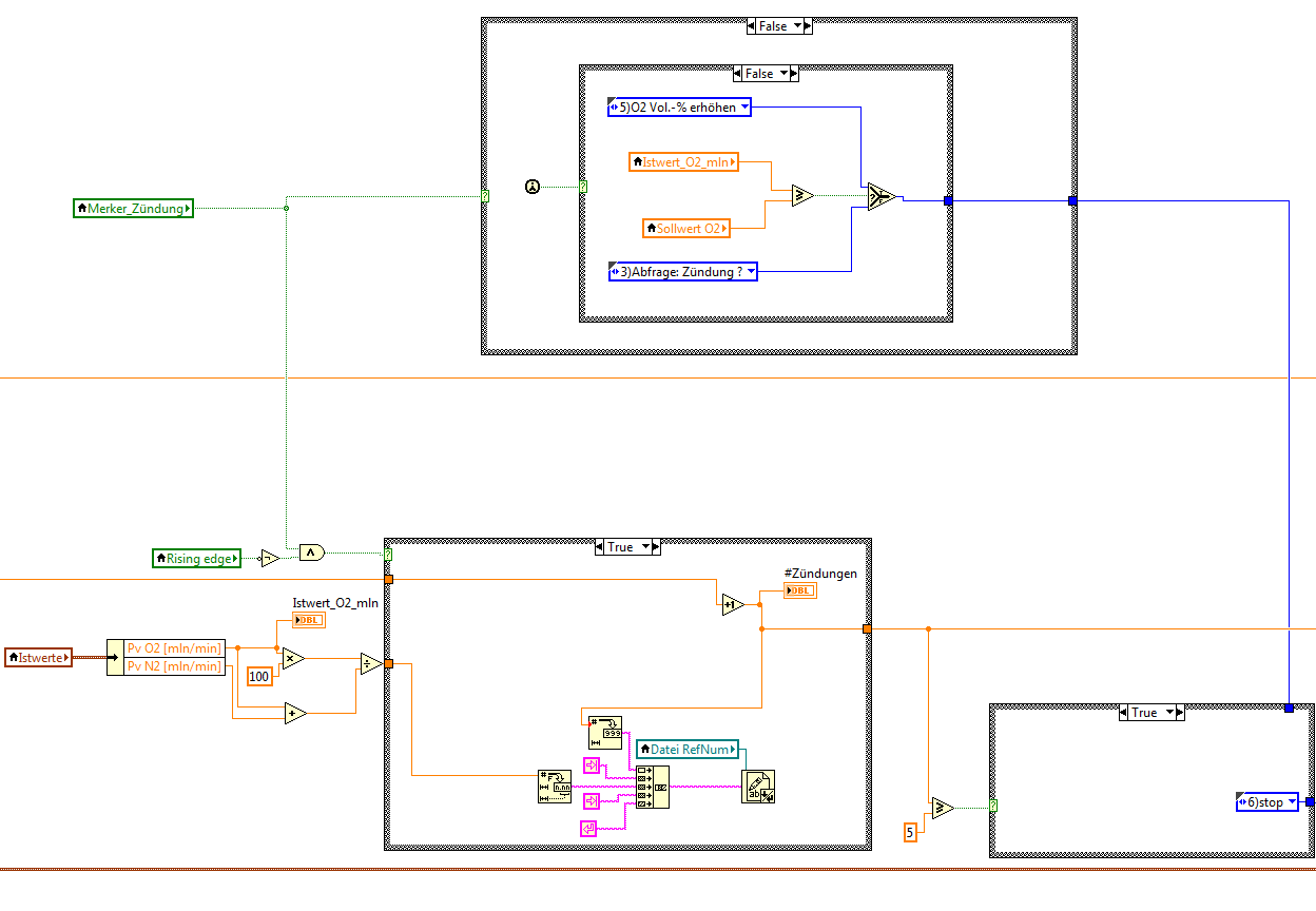 Ok. Ich durfte noch nicht reelles Brenngas zünden. Deshalb habe ich zum Probieren einfach ein bolesches " Zündung Auslösen" . Wenn man einmal drück wird quasi die Zündung simuliert. Allerdings es wird ständig die Zündung gezählt also 1, 2, 3... da es ja ständig rot ist. Um das zu zu vermeiden klicke ich wieder drauf und somit finden die MFC`s genug seit um zurückzufahren. Es klappt soweit aber in reellem Fall wird es ja nicht so sein sondern es wird rot bleiben und solange das der Fall ist wird die Zündung bis auf 5 gezählt, ohne dass der MFC in dieser Zeit auch 5 mal zürück- und wieder hochdosieren kann, was meine Ergebnisse dann auch verschlechtert wird.