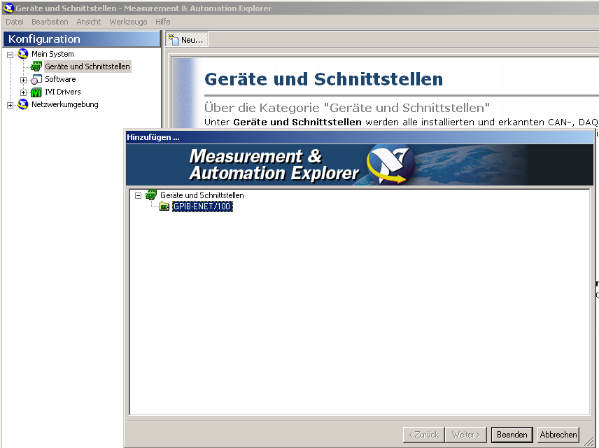 siehe Anhang, plus die letzten Einträge VISA TCP/IP Resource und GPIB-ENET/100
