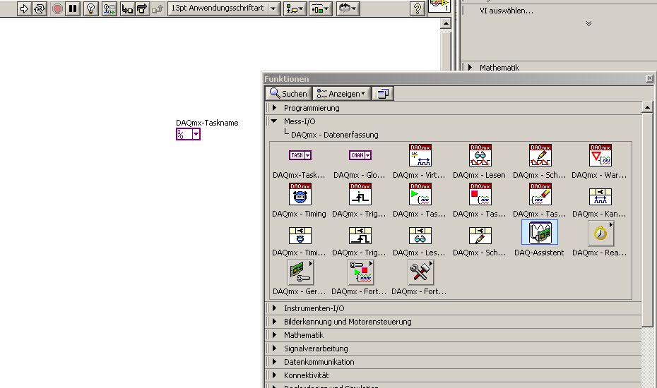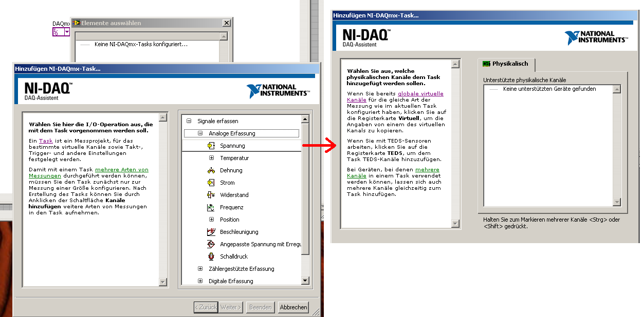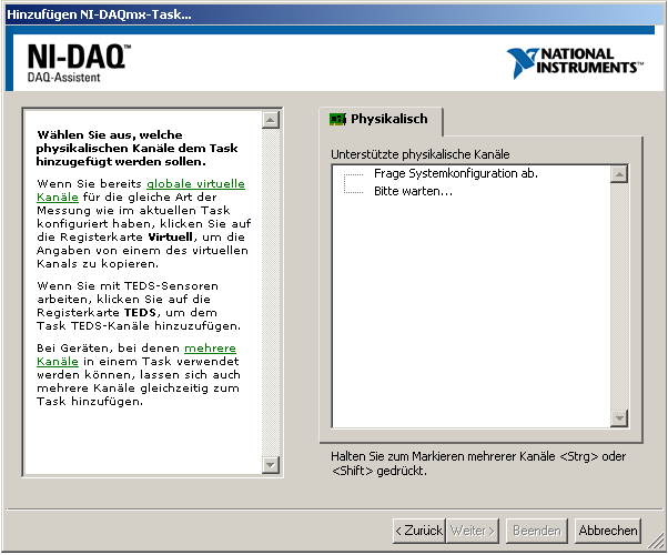 Meine Versuche beschränken sich auf den DAQ Assistent, dort Signale erfassen, Analoge Erfassung von Spannung. Aber bei der anschließenden Suche ergibt sich bei mir dann nichts außer "Bitte warten...". Ich hab das Gerät ja auch nicht dran.
