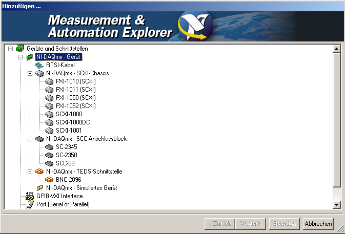 Analog zu Geräte und Schnittstellen kommt der Fehler (siehe Anhang) und danach verschwindet das Plus-Zeichen davor, s.d. eben nichts auswählbar ist. Müsste da DAQmx zu sehen sein?