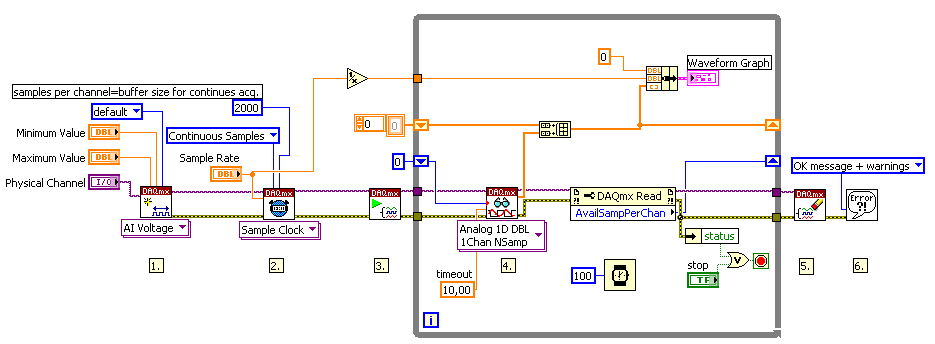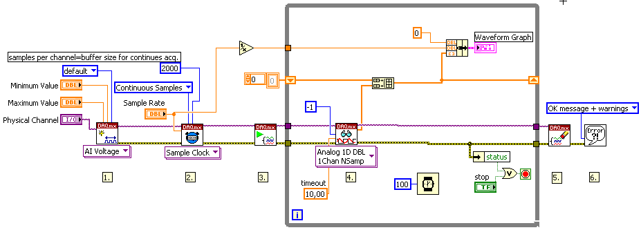 Tu ich dann im DAQ-Assi den Frontpanel öffnen, bietet sich die Möglichkeit den timeout bei read.vi zu ändern, aber das nützt in diesem Falle auch nichts. Ebenfalls kann man die "Anzahl der Samples pro kanal" bei read.vi ändern, voreingestellt ist -1, was ich merkwürdig finde. Wenn ich es auf 1 setzte, dann läuft zwar meine Schaltung eine Weile, aber mir fehlt da das Verständnis um hinterzusteigen, was die einzelnen Elemente bewirken.