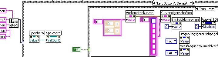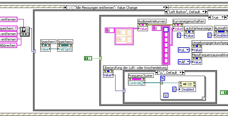 Vielleicht kann ich es nochmal erklären! Also hier habe ich lauter cases in denen ich die Ereignisse der Bedienelemente programmiere. Im Ereigniss "Alle Messungen entfernen" soll erst das Ereignis "Speichern" (das als extra case Ereignis [17] angelegt wurde) aufgerufen werden um die Messungen zu speichern. Nach der Speicherung soll dann der Graph und die Kurveneigenschaften gelöscht werden, also mit 0 beschrieben werden.