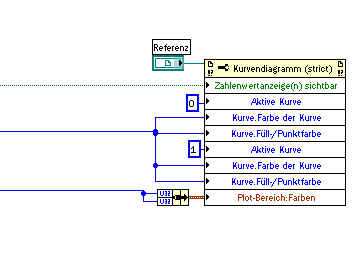 Nun möchte ich das Anzeigen bzw. Nichtanzeigen programmatisch lösen. Dazu gibt es im Eigenschaftsknoten die Eigenschaft "Zahlenwertanzeige(n) sichtbar". Mit einem booleschen Schalter versehen, funktioniert das aber nur für den Wert der Kurve 0. Der Wert der Kurve 1 wird davon nicht beeinflusst.