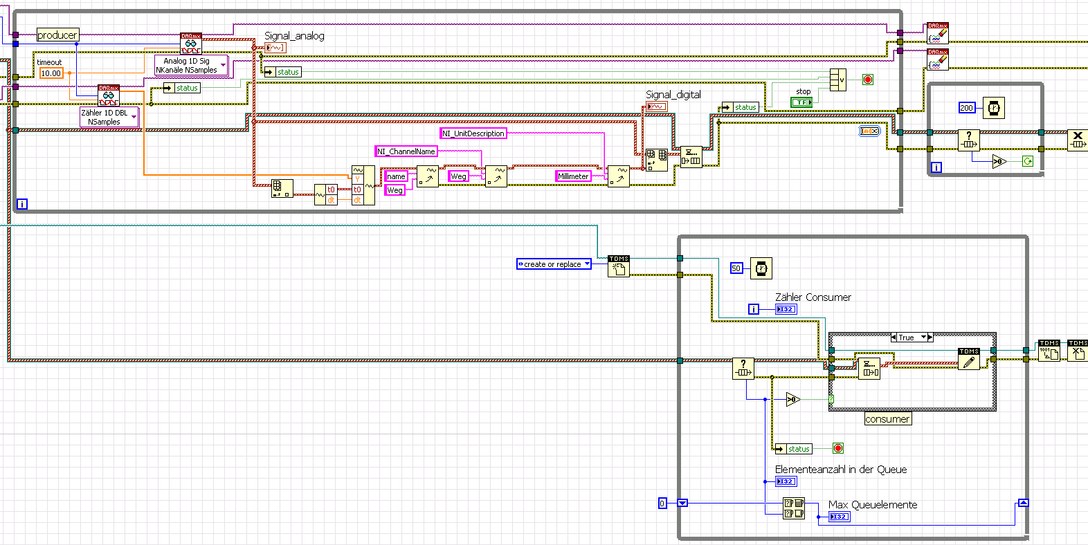 Was ich nun gemacht habe um die CPU-Last und die Speicherauslastung zu reduzieren ist, dass ich nur eine feste Anzahl an Samples lese (hier entsprechend der Samplerate 10x pro Sekunde) und meine Consumerschleife doppelt so häufig abfrage. Dann wird die Signalverlaufsinformationen der analogen Messung extrahiert und den einfachen Doublewerten des digitalen (Counter-)Signals hinzugefügt, damit ich einen Signalverlauf erhalte (scheinbar ist es anders nicht möglich, da der Counterkanal kein Signalverlauf ausspuckt). Danach setze ich beide Signale zusammen und schreibe sie per TDMS schreiben in eine Datei.