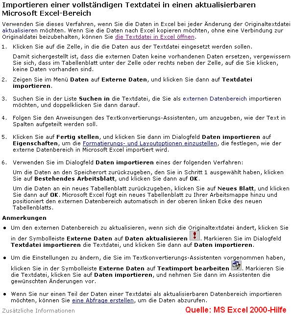 ' schrieb:Hi. Nehme mit einem Sensor Messdate auf und speichere sie in einer Textdatei. Nun möchte ich diese Textdatei mit Excel öffnen und mit einem Macro bearbeiten. So wei so gut. Nun möchte die nexte Messung, die vorher wieder als Textdatei gespeichert wird in dem selben workbook wie zuvor importieren nur in ein neues sheet. Hat jemand Ahnung wie ich immer wieder Daten von einer Textdatei in ein neues Sheet importieren kann. Vielen Dank