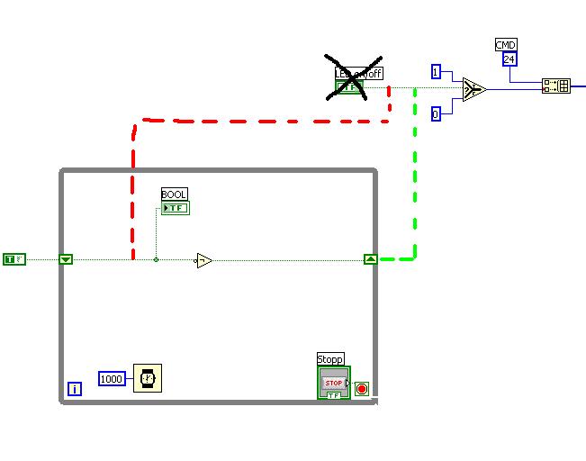 danke, konnte es jetzt nachbauen. An der Anzeige "BOOL" erkenne ich auch das es blinkt, also klappt. Aber ich schaffs jetzt nicht die Sache an mein bestehendes VI anzuschließen.