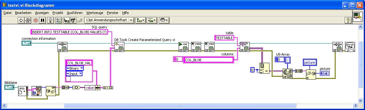 Dazu muss eine Parameterized Query mit dem VI "DB Tools Create Parameterized Query.vi" erzeugt werden, der als Parameter die binären Daten in Form eines U8-Arrays übergeben werden (z.B. durch Serialisierung der Daten in einen String und Umwandeln des Strings in das U8-Array). Die Größe der binären Daten ist dabei nicht beschränkt (nur durch die mögliche BLOB-Größe des Datenbanksystems).