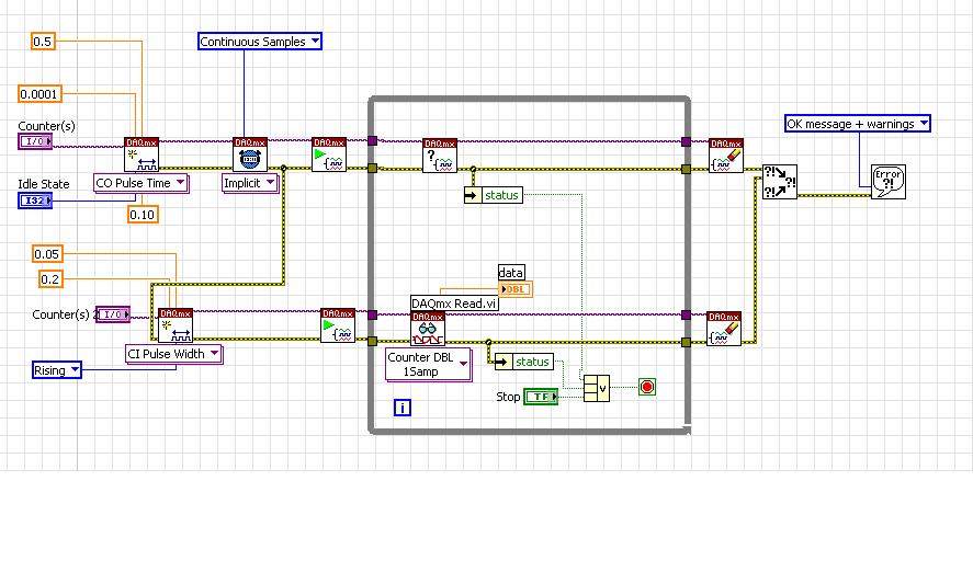 Mit meinem Counterausgang 0 gebe ich kurze Impulse aus (0.1usec). Diese Impulse werden an einen Ultraschallsensor (http://www.acroname.com/robotics/parts/R93-SRF04.html) übertragen, der mir anschliessend ein Antwortsignal sendet. Von diesem Signal sollte ich die Impulsbreite wissen, da mir diese Rückschlüsse auf die gemessene Distanz gibt. Alles klappt wunderbar wenn ich es mit LabVIEW ansteuere und mit dem KO ausmesse, wenn ich nun aber LabVIEW zum Messen der Impulsbreite verwende, klappt es einfach nicht ... falsche Impulsbreiten, Störungsmeldungen, etc...