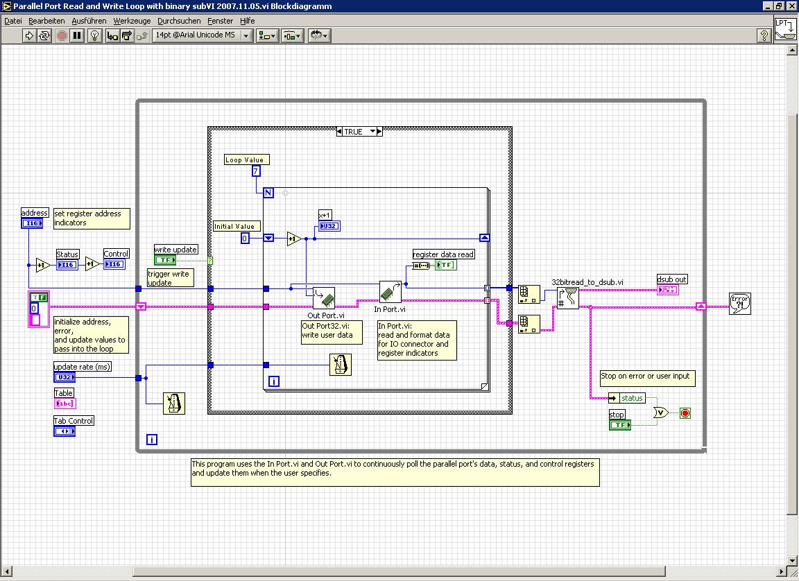 1. warum muss ein Array indizieren.vi (Array Index.vi) sowohl von Adresse auch von Fehler zwischen In Port.vi und 32bitread_to_dsub.vi eingesetzt werden? wegen der For-Schliefe? Bei originaler Schaltung ist es nicht benötigt. (Bild Parallel Port True Case.jpg)