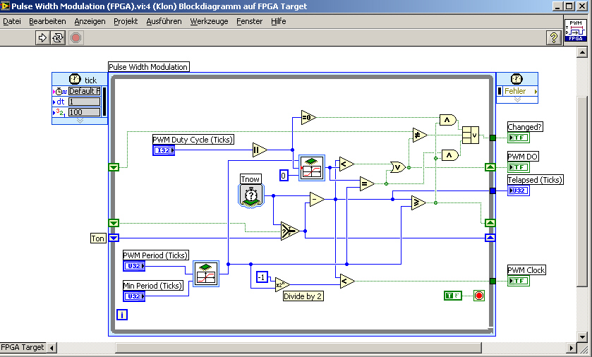 Will ein PWM-Signal an einem digitalen ausgang (5V TTL) am NI9403 Modul mit dem cRIO-9012 realisieren. Will dazu über ein host-VI die frequenz in Hz und die PWM in % vorgeben, anschließend die periodendauer über die frequenz ausrechnen & die zeit in der der ausgang log. high ist über die % und die zuvor ermittelte periodendauer ausrechnen & diese dann an das FPGA VI übergeben und mittels timer (loop timer) den ausgang dementsprechend schalten.