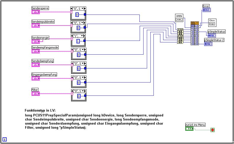Im DLL-Knoten sind aber alle Parameter 32Bit breit (oder vielfachen davon)! Auch ein Char oder ein Word wird mit 32Bit übertragen! Zu diesem Ergebnis bin ich gekommen, weil mein Prototyp Chars enthält, und ich in LV für diesen Parameter I32 angeben kann - und umgekehrt.