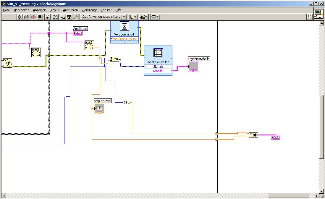 Den wohl wichtigen Teil des Programms habe ich als jpg angehängt, ich hänge aber auch das gesamte Messprogramm an (ich wusste zu Beginn gar nicht, dass man Sub-Vi's erstellen kann, deshalb ist es so groß - peinlich). Dieses gesamte Programm hab ich dann als Sub-VI zusammengefasst und in ein anderes VI eingefügt, um es besser bedienen zu können. Das füge ich dem ganzen auch an.
