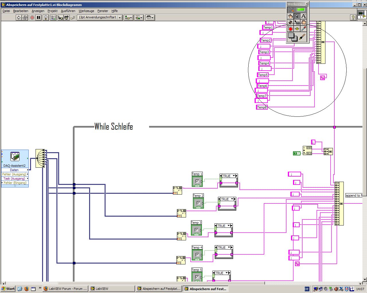 Sorry, aber ich habe ja schon geschrieben dass ich blind nichts raten kann. Mach zumindest ein Screenshot deines Blockdiagramms. Dein VI kann ich nicht öffnen, weil ich nur LV 8.0 habe.