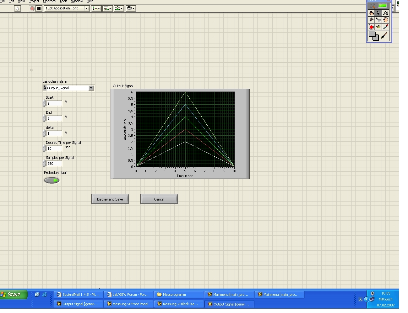 Du generierst ja fünf Signale: ((End-Start)/Delta + 1)=5 auf erste Schleife, die erstellt ein Array mit 5 Werten. Dieses Array geht indiziert und als Schleifenzähler in die zweite Schleife, in der du dann 5 "parallele" Signale (also ein zweidimensionales Feld) erzeugst. Diese nun werden als fünf Graphen, von denen jeder wie ich das so sehe 250 Punkte hat, angezeigt. Willst du die 5 Signale hintereinander, so musst du statt des indizierten Ausganges eine Addition z.B. per Schieberegister machen.