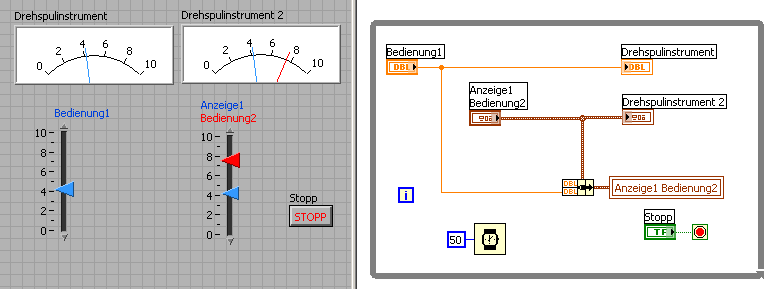 Man konfiguriert den Schieber als Bedienelement (Controler), und erstellt davon eine Lokale Variable (beschreibbar). Das Anzeige-Schieberelement beschreibe ich mit dem Wert, welcher angezeigt werden soll (Im Beispiel ist das der Wert von Bedienung1) Damit das andere Element des Clusters nicht unangeschlossen bleibt, wird es mit seinem eigenen Wert beschrieben. Das ist eine Operation, die nichts bewirkt und nichts schadet.