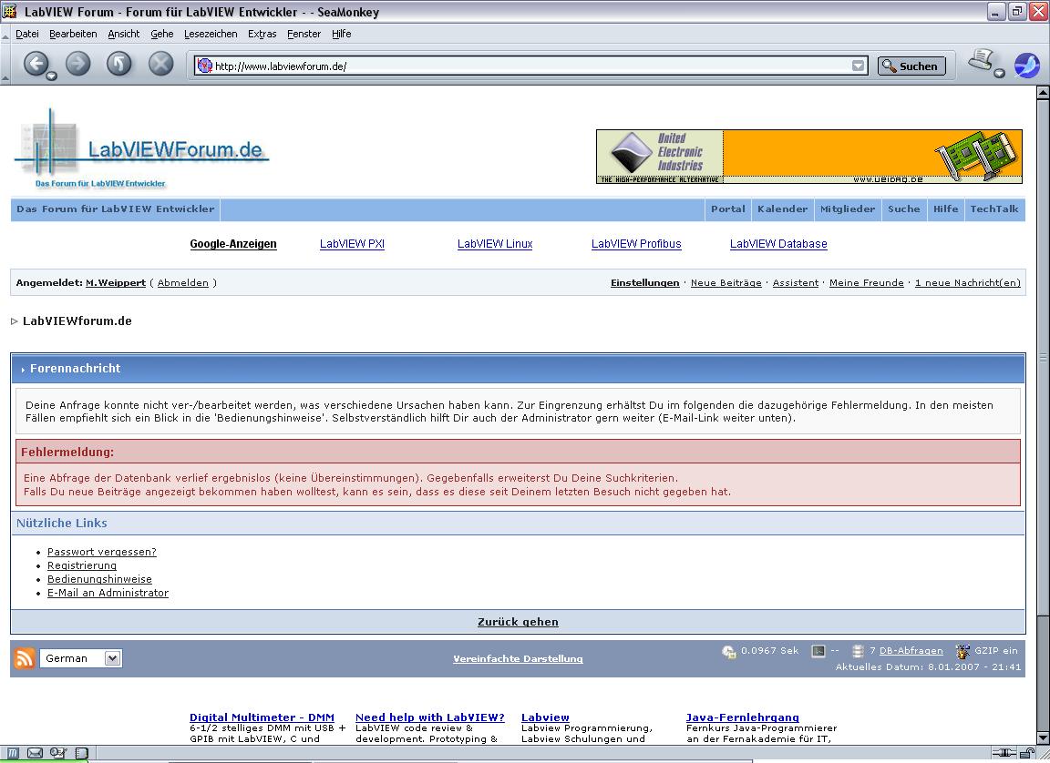 der DB-Fehler kam gerade (8.1.2007, 21:41 Uhr) nach Klick auf "Neue Beiträge" wieder und hier ist der Screenshot dazu.
