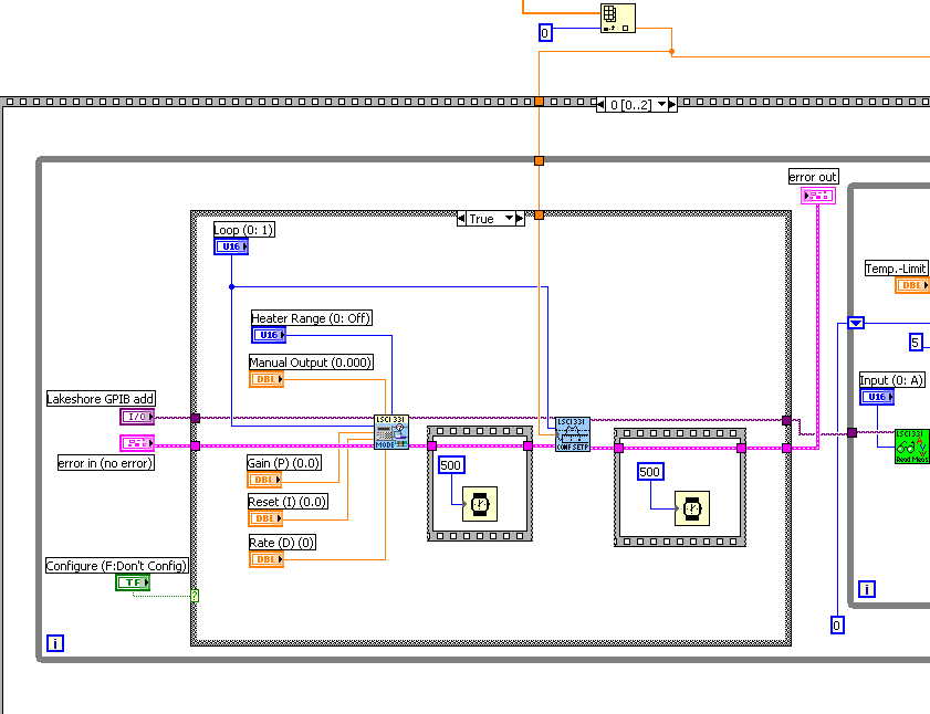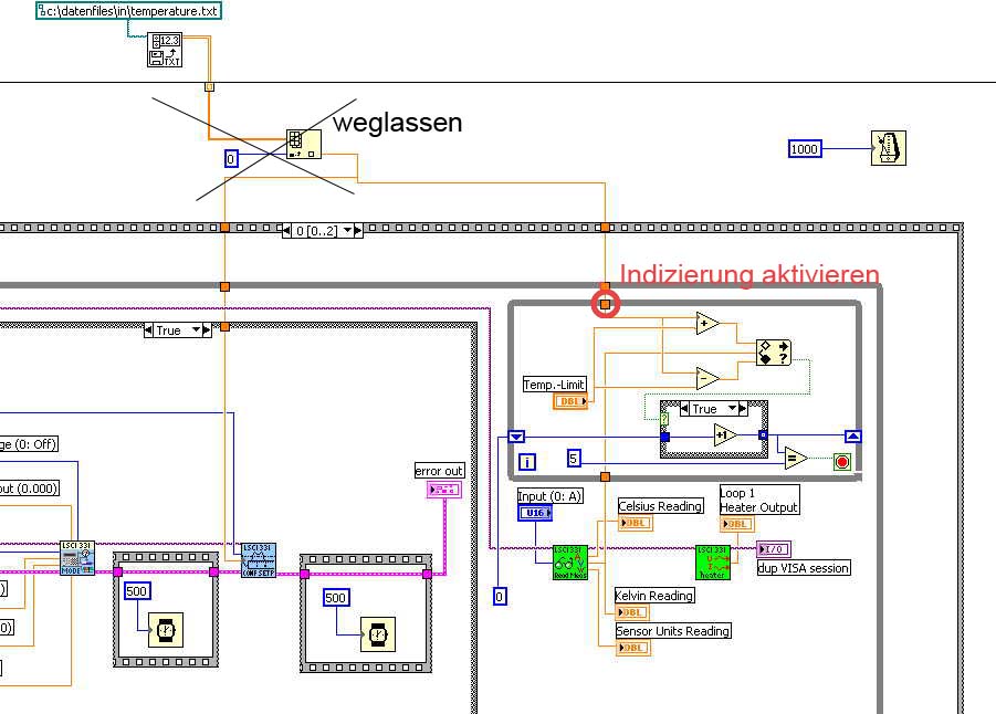 der Temperaturwert, den Du meinst ist der Sollwert. Dieser wird dann mit dem Istwert verglichen (Feld "Kelvin-Reading"). Ich muß mir die Temperaturwerte einzeln aus einer Datei holen und stabilisieren. Dann wird bei der aktuellen Temperatur eine Strom-Spannungs-Kennlinie gefahren. Ist diese aufgenommen, wird eine neue Temperatur angesteuert usw.