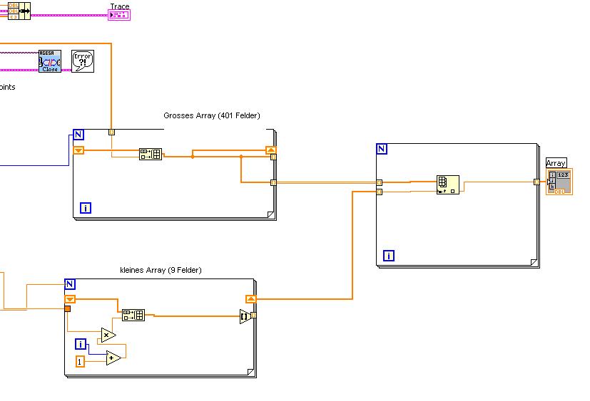 Das liegt wohl daran, dass die Arrays mit Hilfe von Schieberegistern erstellt werden. Bei der ersten Ausführen erhalte ich ein Array mit Achtmal den Wert Null, führe ich das Programm ein zweites Mal aus, werden 16 Mal Werte in das Array reingeschrieben, die aber nicht mit dem grossen Array übereinstimmen. irgendwie stimmt die Synchronisation nicht.